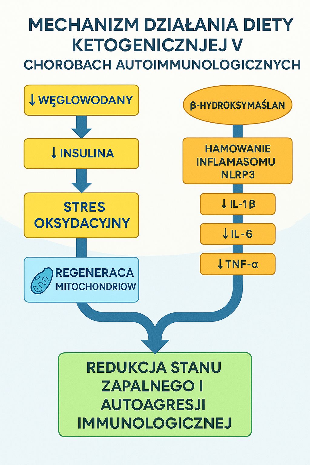 Diety niskowęglowodanowe i ketogeniczne stanowią obiecujące narzędzie terapeutyczne w leczeniu chorób autoimmunologicznych. Mechanizmy obejmują hamowanie inflamasomu NLRP3, poprawę funkcji mitochondrialnej, uszczelnienie jelit i redukcję stresu oksydacyjnego.