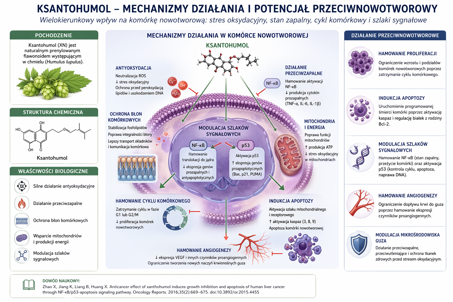 Badania Zhao i wsp. (2016) wykazały, że ksantohumol hamuje wzrost komórek raka wątroby oraz indukuje apoptozę poprzez regulację osi NF-κB/p53, co potwierdza jego bezpośredni wpływ na mechanizmy nowotworzenia.
