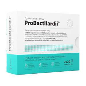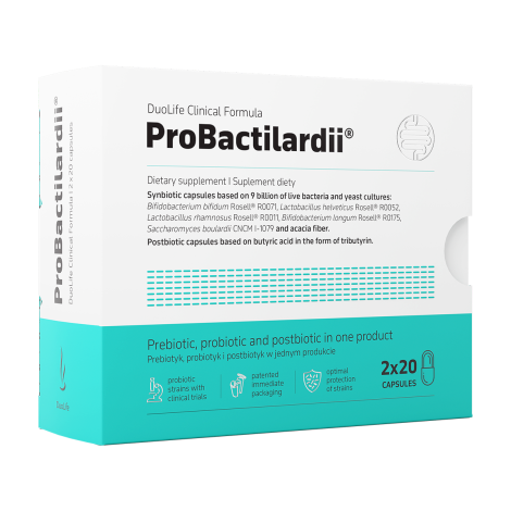 ProBactilardii® jest kompleksowym suplementem diety, złożonym z 2 uzupełniających się kapsułek. Kapsułka Synbiotic zawiera prebiotyk (w postaci błonnika z akacji) oraz zastrzeżoną formułę probiotyczną BACTILARDII®, opartą na 4 szczepach bakteryjnych oraz 1 szczepie drożdży, których żywotność jest gwarantowana na koniec daty ważności produktu. Kapsułka Postbiotic – zawiera postbiotyk w formulacji opartej na kwasie masłowym. ProBactilardii® cechuje się nie tylko innowacyjnym składem, ale również opatentowaną formulacją i opatentowanym opakowaniem bezpośrednim, zapewniającymi maksymalną ochronę szczepów drobnoustrojów zawartych w kapsułce.