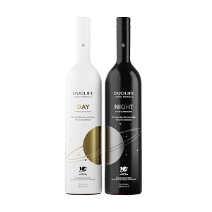 DuoLife Dzień: sok z owoców winogron, sok z owoców dzikiej róży, sok z owoców czarnego bzu, sok z owoców głogu, sok z owoców żurawiny wielkoowocowej, sok z owoców granatu, sok z owoców noni, sok z owoców rokitnika, sok z owoców malin, ekstrakt z owoców dzikiej róży, ekstrakt z jagody acai, ekstrakt z ziela lucerny 10:1 (45,8 mg/25 ml), ekstrakt z korzenia żeń-szenia (27,49 mg/25 ml, w tym 3,79% ginsenozydy – 1,04 mg/25 ml), ekstrakt z liści aloesu 200:1 (9,16 mg/25 ml, zawartość aloiny < 1 ppm).